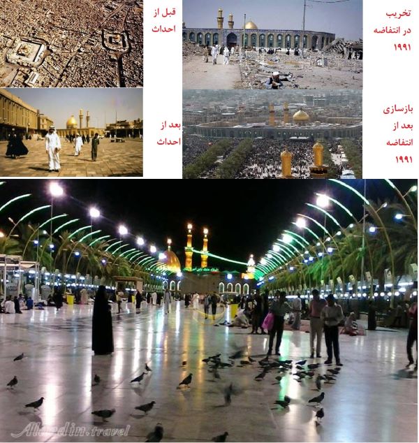 بعد از دو جنگ صدام با ایران و کویت و انزوای بینالمللی عراق، صدام زیارتهای دیپلماتیک از کربلا را تعطیل کرد و این بُعد از اهمیت سیاسی کربلا برای حکومت صدام از بین رفت. قیام شیعیان در انتفاضۀ ۱۹۹۱ م و حمله به کربلا، صدمات بسیاری به حرمین کربلا وارد ساخت. اگرچه سالهای بعد، حکومت صدام در پی بازسازی برآمد، اما تا زمان پس از صدام آثار حمله به حرمین کربلا دیده میشد. پس از انتفاضه و صدمات فراوان به حرم، بینالحرمین توسعه یافت. در ۱۴۱۵ ق/۱۹۹۴ م به همت شیعیان بغداد درختکاری بینالحرمین انجام شد.
